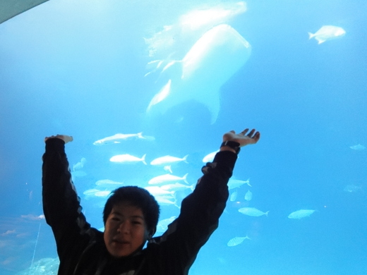 池中巨大的鯨鯊目測大約有五六公尺,據說還只是隻「鯨鯊寶寶」,將來牠可以長到十五公尺長哩!