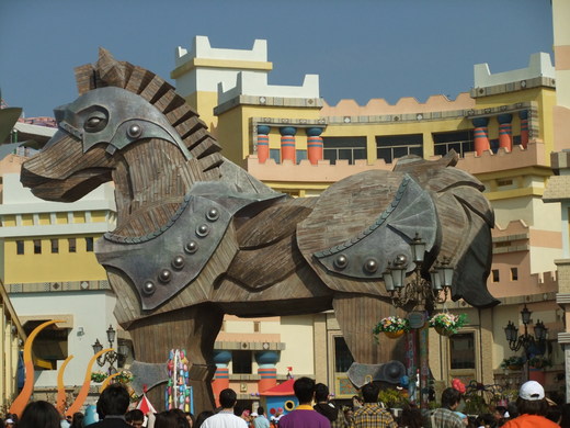 我來義大世界最主要想看的「飛越臺灣」,就在重現木馬屠城的特洛伊城裡。飛越臺灣是一種三層樓高的模擬空中飛行設施,可以讓人經歷像搭乘輕航機般,從高處俯瞰臺灣。面前的大螢幕帶著我們從高雄的85大樓起飛,一路看到墾丁、臺東、阿里山、日月潭……繞過101大樓時猛一轉彎,嚇得我叫出聲來。