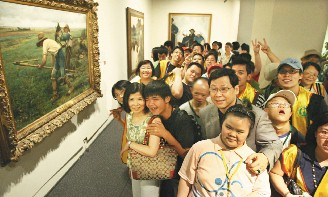 【聯合報╱記者楊芷茜/台北報導】 2008.08.27 03:13 am 記者陳正興/攝影 為了一睹米勒真跡,14位彩虹家園的中重度心智障礙學員在師長、社工員陪同下,首度從北投搭乘捷運、公車、步行前往國立歷史博物館,參觀「驚豔米勒─田園之美畫展」。