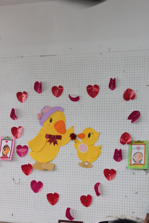 在黑板上放了很多同學畫媽媽的圖