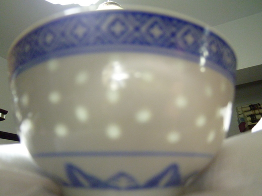 它有二層,也可以轉動..,重點在盛熱飯時不燙手,買回來時只覺得它有一點特別,確沒使用過。另外,還有一個磁碗;看起來很普通..也不貴,特點是能透光,它在光線下會出現很多圓圈,所以忍不住也買下來…