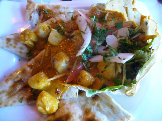 一整頓吃下來,我們都喜歡那清爽的干貝,配上甜、酸、辣醬,非常juicy,被成型的印度麵包包裹著,好看又好吃。還有那印度大蒜麵包,烤得剛剛好,有點焦,有點軟,溫熱加上蒜香,簡直是愛澱粉的小女人的最愛。