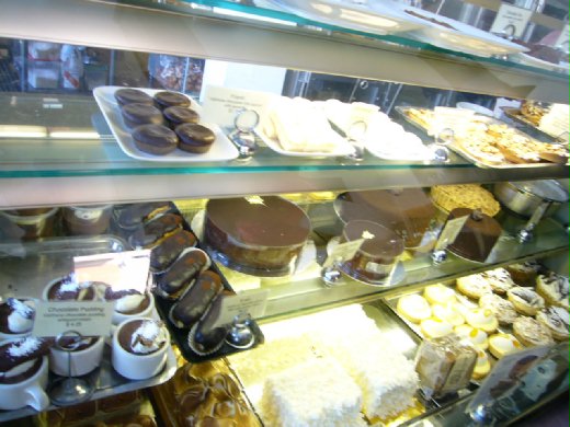 甜點蛋糕在玻璃櫃子裡面美麗,琳瑯滿目,老公點了巧克力麥片餅乾、椰子塔,我點了起士火腿吐司,外加兩人分食的牛肉熱三明治,外加熱Latte一杯。