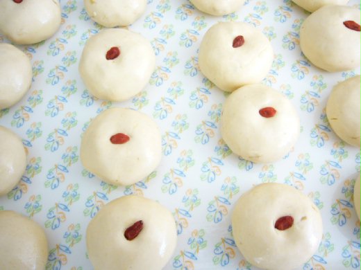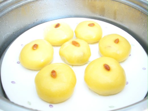 - 將材料(1)全部放入盆中,混合拌勻揉成米糰,再切成適量大小,將每個先揉成圓形,再壓扁,將餡料包入捏緊,再將形狀稍為「整形」,最後加枸杞子放至上面點綴。