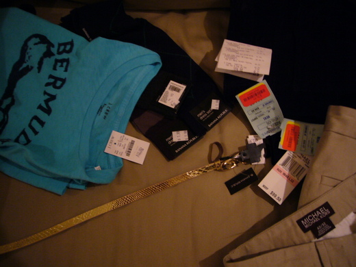 那天,老公買了Banana Republic一雙$1.99襪子,夏季、冬季的好質料襪子;某個周末晚餐過後,兩人牽手到Mall走走,兩件卡其褲(一黑一白)、ㄧ件黑色絨褲,卡其褲一件$18、Michael Kros絨褲原價$99,打折再打折,只要$6。Crabtree & Evelyn's乳液只要$5。CK皮帶一條$5.99。JCrew的老公T恤,ㄧ件$12.99再打40%off。