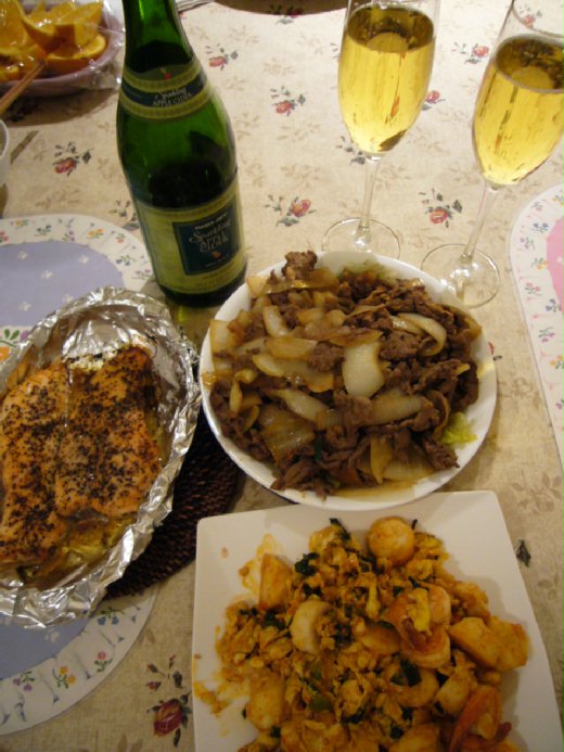 一如往常,在老公回家前,準備好晚餐,洋蔥炒牛肉鋪上生菜、韓國甜辣醬炒海鮮、奶油黑胡椒烤鮭魚。開了一瓶 Trader Joe’s 的蘋果西打,用透明高腳杯裝上美美的金黃香檳汽水飲料,舉杯慶祝。簡單的兩人晚餐,感覺很溫馨。