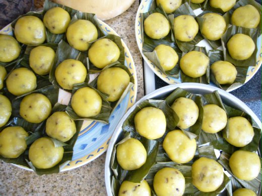 3.將外皮團分成數個小團,分別包入內餡,揉勻後壓平。 沾油,放在每一片粽葉。