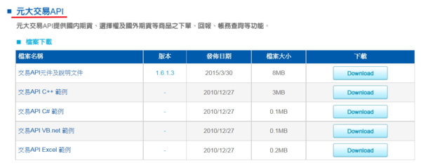 ●元大交易API:提供國內期貨、選擇權及國外期貨等商品之下單,回報、帳務查詢等功能。