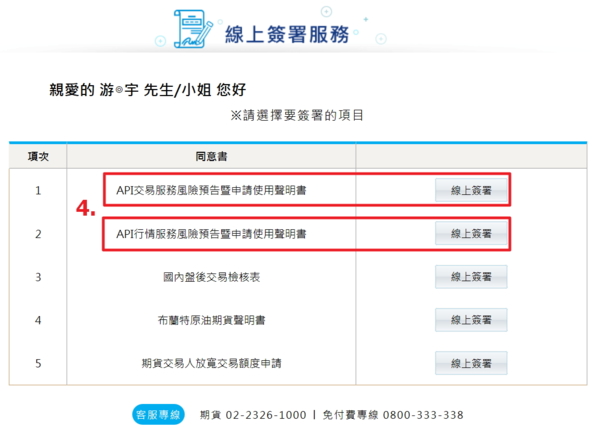 (四).選【API交易服務風險預告暨申請使用聲明書】及【API行情服務風險預告暨申請使用聲明書】線上簽署