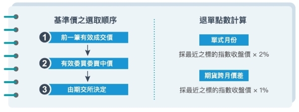 單式月份 採最近之標的指數收盤價×2%(達量化指標時,退單百分比放寬為4%)