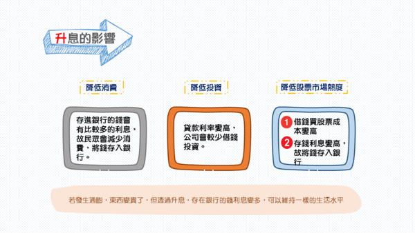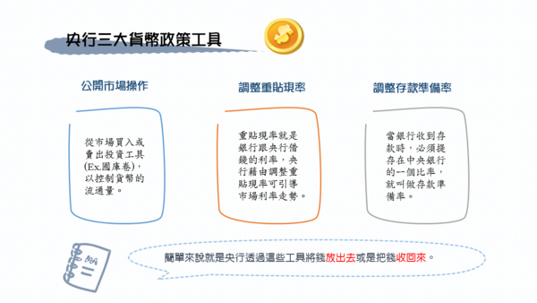 - 調整重貼現率:若重貼現率上升,銀行跟央行借錢利率變高,銀行會減少跟央行借錢,央行就是想減少放出的貨幣,這會帶領利率上升。