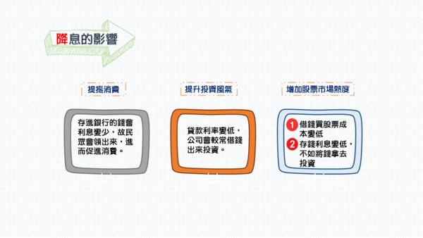 - 調整存款準備率:當調升存款準備率,銀行可貸放的錢變少,會帶領利率下跌。