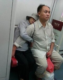 在廣州地鐵里——沒有擁抱,沒有接吻,沒有日落,沒有沙灘,沒有帥哥或美女。有的只不過是一個1米多的座位。一個男人體貼地伸出手擋住妻子的座位以使得她睡得安穩。蓬鬆的頭髮,男人眼中滿是血絲,腳下是一包包的山草藥。不難看出,男人也十分疲憊。但是,他依舊打著精神為自己愛的女人守護著。