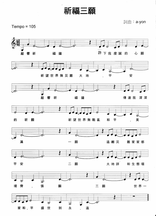 簡單的歌詞,但是道盡了每個人心中最深切的期望!這首曲子,其實是比較注重樂音。以鐘聲(我買的軟體所附的鐘聲不理想,只好改用鋼琴)傳達平安訊息...........