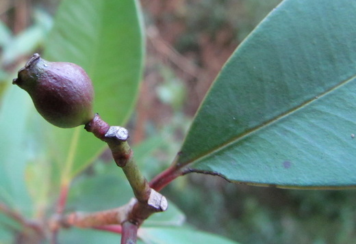 這就是種在救荒本草堂觀鵝亭後方下坡小徑旁的高士佛赤楠,由於挖掘時不小心傷到根部,種下那一年差點死掉,第二年又被白蟻纏身,第三年狀況才轉好,發現它的對生葉,葉形卻不大一樣,有的長橢圓形,有的是倒卵狀長橢圓形或卵狀披針形,而且葉子屬厚革質,葉被有多數腺點,非常有趣。