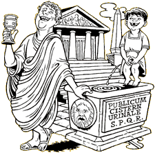 在古罗马帝国,有一位声言“皇帝必须站着死”的名叫韦斯帕希安(Vespasien)的皇帝,便是一位因创建“公共尿池”和征“撒尿税”而虽“臭”名昭著、但仍功不可没的历史人物。韦斯帕希安曾让人在罗马城内到处置放陶土大罐,供市民撒尿使用,并因此设立了一种名为“Chrysagyre”的撒尿税;居住在罗马的每户家长须按人头和包括狗、驴、牛在内的牲畜头数(尽管它们从不使用那些“尿盆”!),每四年缴纳一次。他儿子迪图斯(Titus)不好意思去收取这一从尿水中榨取的税款,韦斯帕希安皇帝便对他儿子说出了一句迄今依然令人震憾的名言:“钱是没有味道的!(L’argent n’a pas d’odeur !)”。