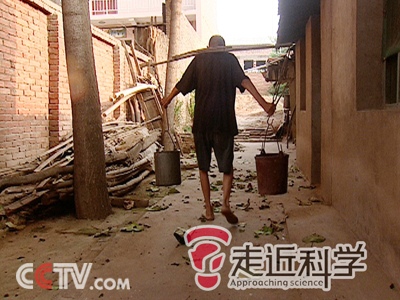 为了证实自己的话,老人立刻用扁担挑起了两个空桶来演示挑水浇地。看老汉动作麻利,很快就把两个桶灌满了水,两桶水的分量少说也要有二三十千克,看着老汉瘦弱的身躯,我们有些于心不忍,但没想到老汉步伐稳健,步履轻盈,我们不由得暗挑大拇指。转眼间老汉就把地浇完了,丝毫没有气喘吁吁的感觉。