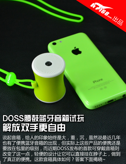 外观小结:这款DOSS腰鼓音箱在首款可穿戴音箱的方面上是相当成功的,重量轻,体积小,笔者把它挂在脖子上半天下来也没有觉得累或是不适,六色可选,多样化的设计也让很多人可以找到自己中意的Feel。