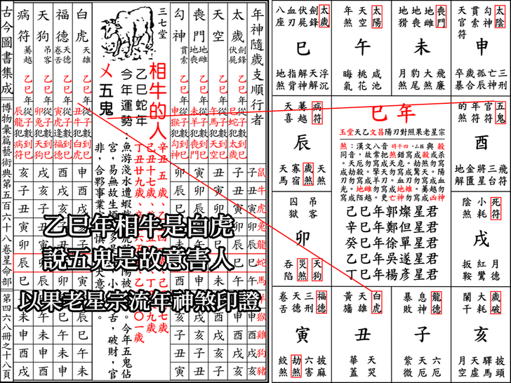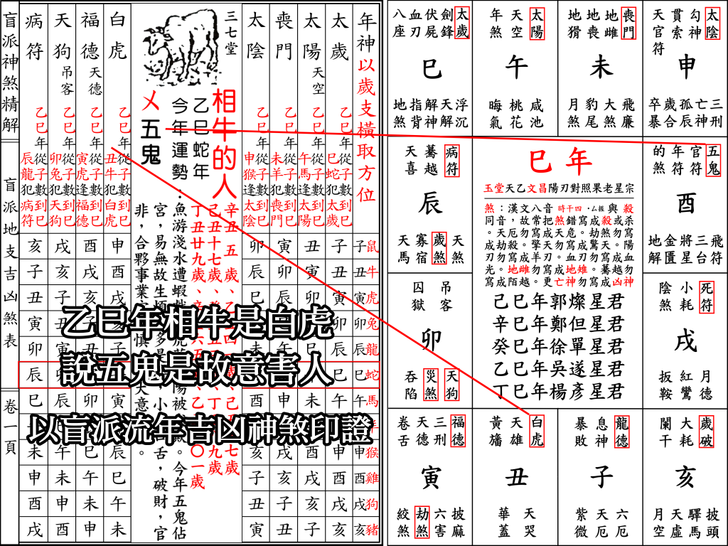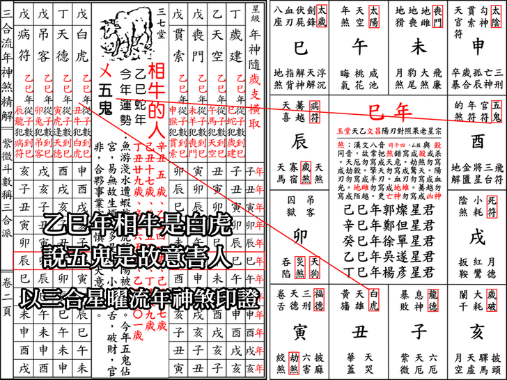 乙巳年宮廟制解補運相牛是白虎,說五鬼是故意害人。以三元流年方位,三合紫微斗數,協記辨方書,果老星宗,盲派神煞印證。