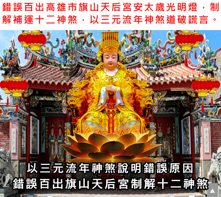錯誤百出丙午年高雄旗山天后宮安斗,安太歲,光明燈,制解補運十二神煞讓人瞠目結舌,以三元源流年方位神煞,道破並說明其錯誤原因精解影片。