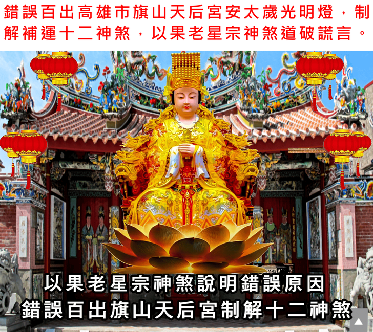 錯誤百出丙午年高雄旗山天后宮安斗,安太歲,光明燈,制解補運十二神煞讓人瞠目結舌,以果老星宗流年神煞,道破並說明其錯誤原因精解影片。