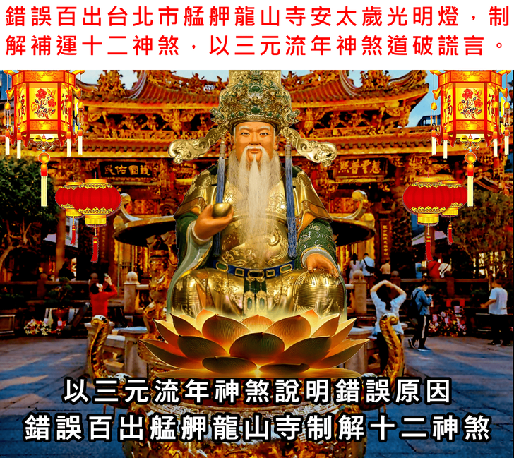 錯誤百出丙午年台北市艋舺龍山寺安斗,安太歲,光明燈,制解補運十二神煞讓人瞠目結舌,以三元流年方位神煞,道破並說明其錯誤原因精解影片。