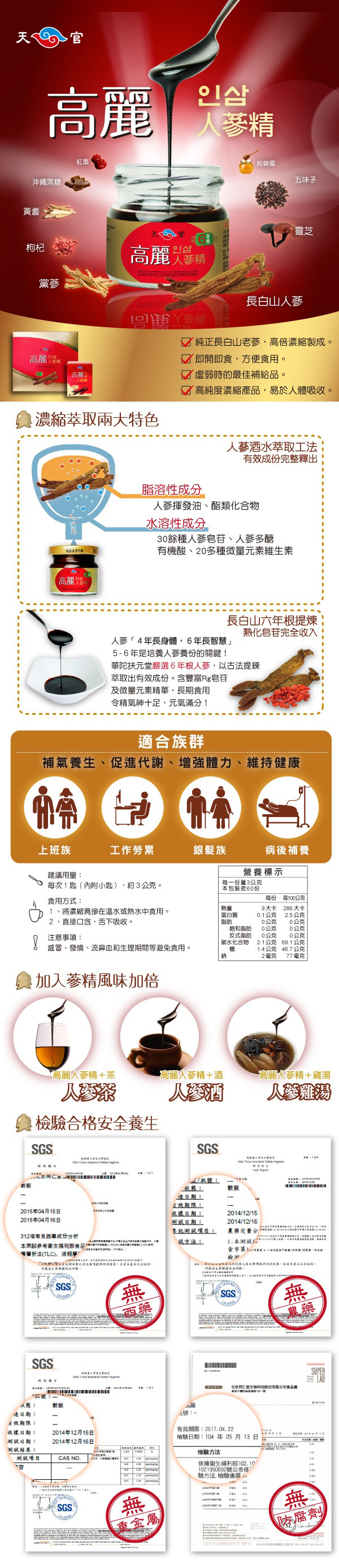 天官高麗人蔘精: 為人蔘,添加靈芝、黃耆、黨蔘等高貴藥材,高倍萃取濃縮而成。 每日酌量食用,即能增進循環,滋補強身,使精神旺盛。