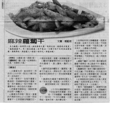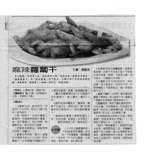 今天打開"世界日報"在"美食天地"中,赫然見到一個"麻辣蘿蔔干"的食譜.