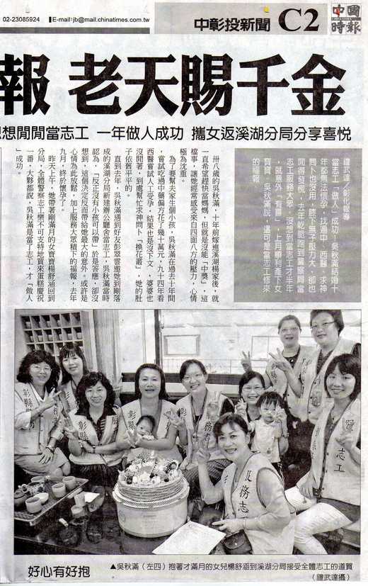為善最樂,幫助別人也能幫助自己,溪湖警察志工吳秋滿,結婚十年 一直都沒有生小孩,也曾經做過多次人工受孕,同樣沒有效,原本以為無法生育,想不到 去年加入溪湖警察志工隊服務後,竟然懷孕了,生了一個美麗的女嬰,讓她是相當開心。