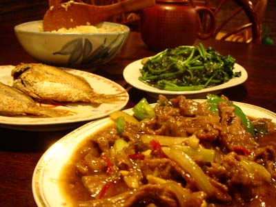 來到文化食堂吃什麼呢?答案是沒有菜單。是的,來到這裡不用點菜,2人三菜一湯、3人四菜一湯、4-5人5菜一湯、6-7人6菜,然後依此類推,一個人200元,豬油飯跟例湯都是吃到飽的喔。兩個人去吃的話,可以吃到一盤炒青菜﹝通常是清炒小白菜或是炒A菜﹞、一盤煎魚﹝不知道是鯧魚還是鯽魚,而且是一人一尾喔﹞、一盤肉﹝有時候是白切肉,有時候是蔥爆牛肉﹞,加上隨你吃的豬油拌飯還有菜頭湯,哇,很有ㄚ嬤的味道。記得小時候外婆都是作這樣的菜給我們吃呢。