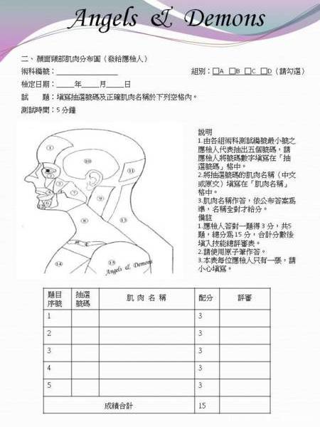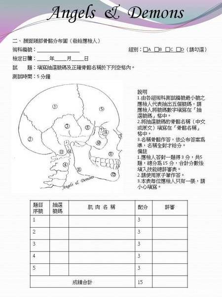 抽寫顏面頸部肌肉分布圖或顏面頸部骨骼分布圖(5 分鐘)