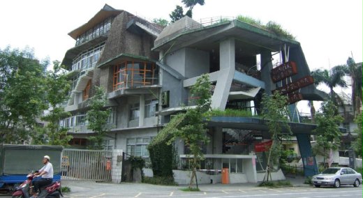 遠遠看這傢伙:柱子喝醉亂站、地板波浪起伏,整棟彎曲的不規則造