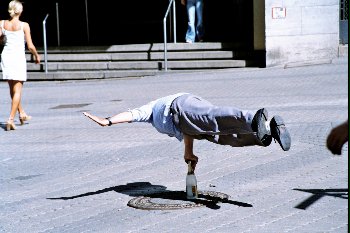 周圍還有表演樂器的、賣小雜貨的、賣冰淇淋的,熱熱鬧鬧地搶著生意,人群還是照常流動,沒有人停下來。他休息了一下,左顧右盼,好像怕引起注意似的,準備好了,又彎下腰,重複這個實在樸實到不行的才藝表演。