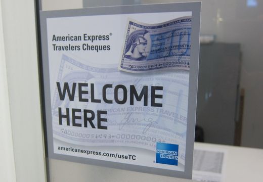 圖二:銀行到處都有貼著歡迎兌換美國運通旅行支票的貼紙,旁邊還有當日匯率。