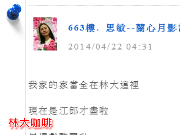 林大(大獎) 於 2014/04/22 22:00回覆 - 1068樓. 梅琪仁2014/04/22 21:48木頭,上回忘了跟妳說,