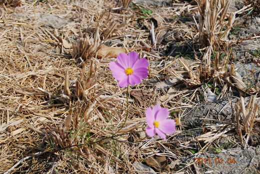 無心插柳的波斯菊,正努力的冒出第二朵花...;木瓜...,依舊沒有,長大...