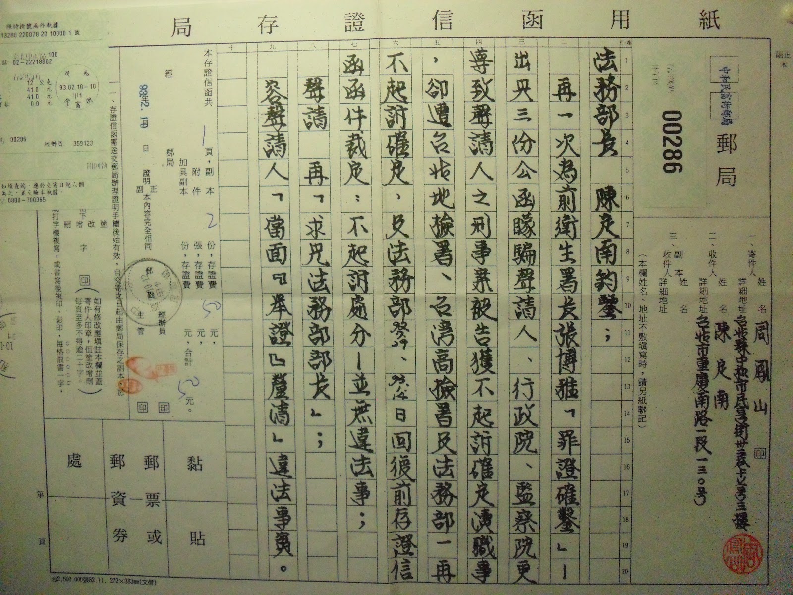 民國106.4.6日親送給蔡英文總統行政院長的聲請書