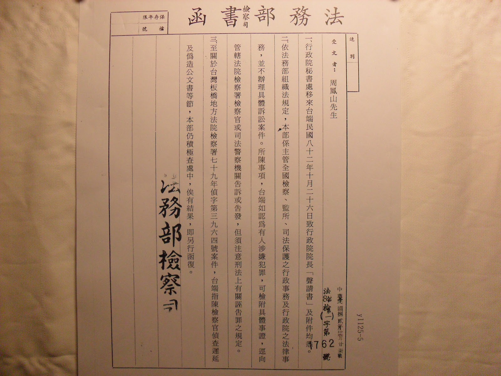 民進黨陳水扁的法務部長陳定南沒有提出任何駁回糾正事項理由就枉法駁回周鳳山ˇ的國賠聲請。 陳定南拒絕【國賠】