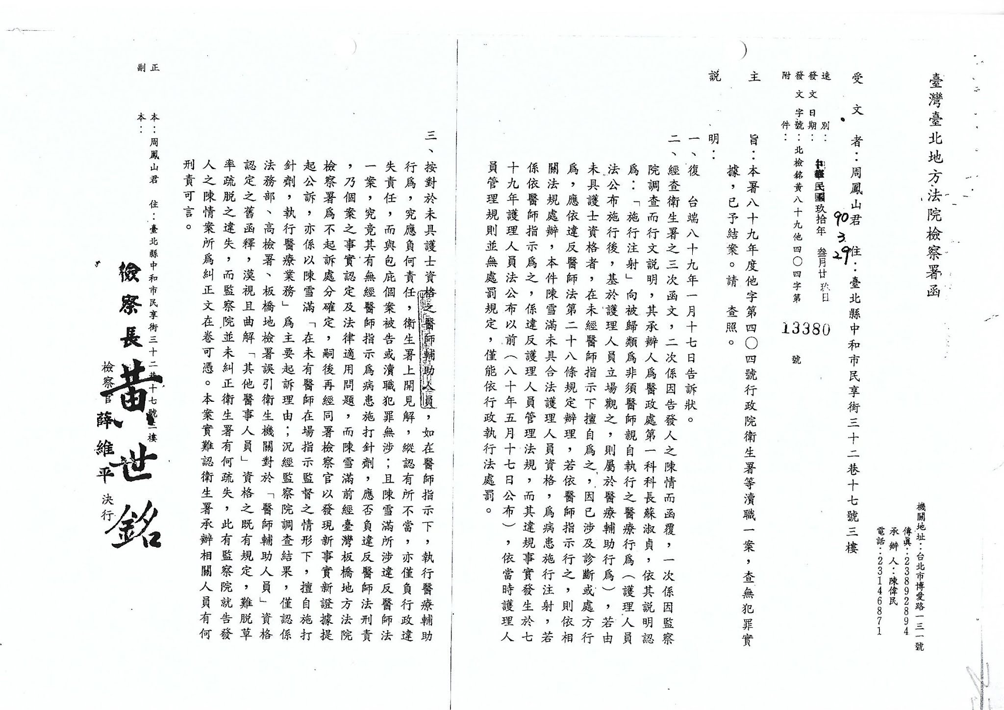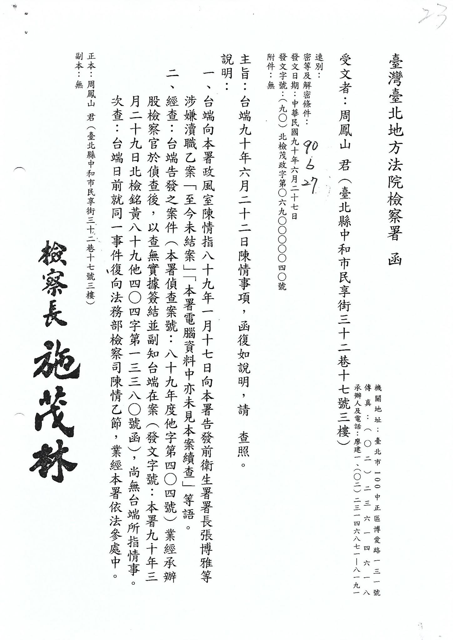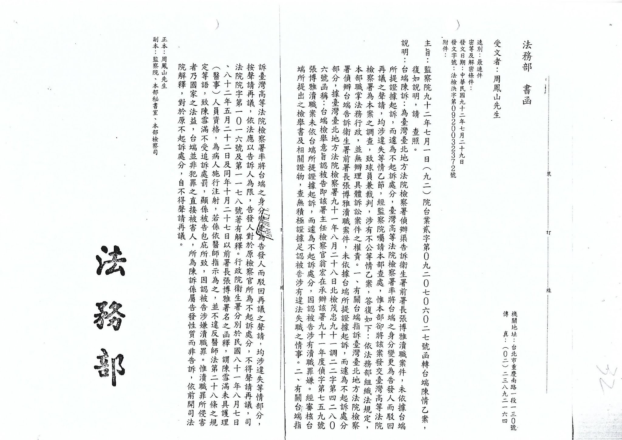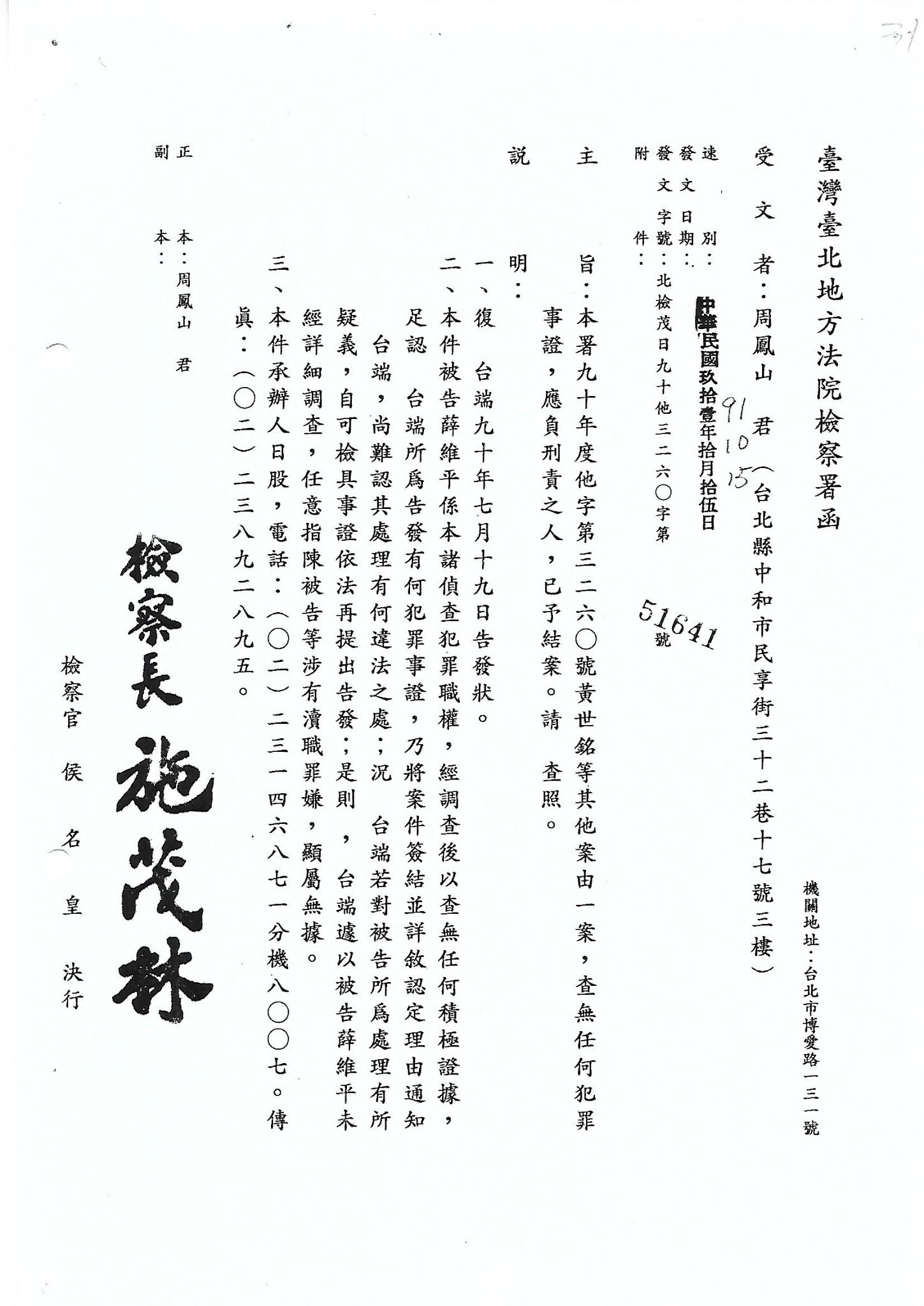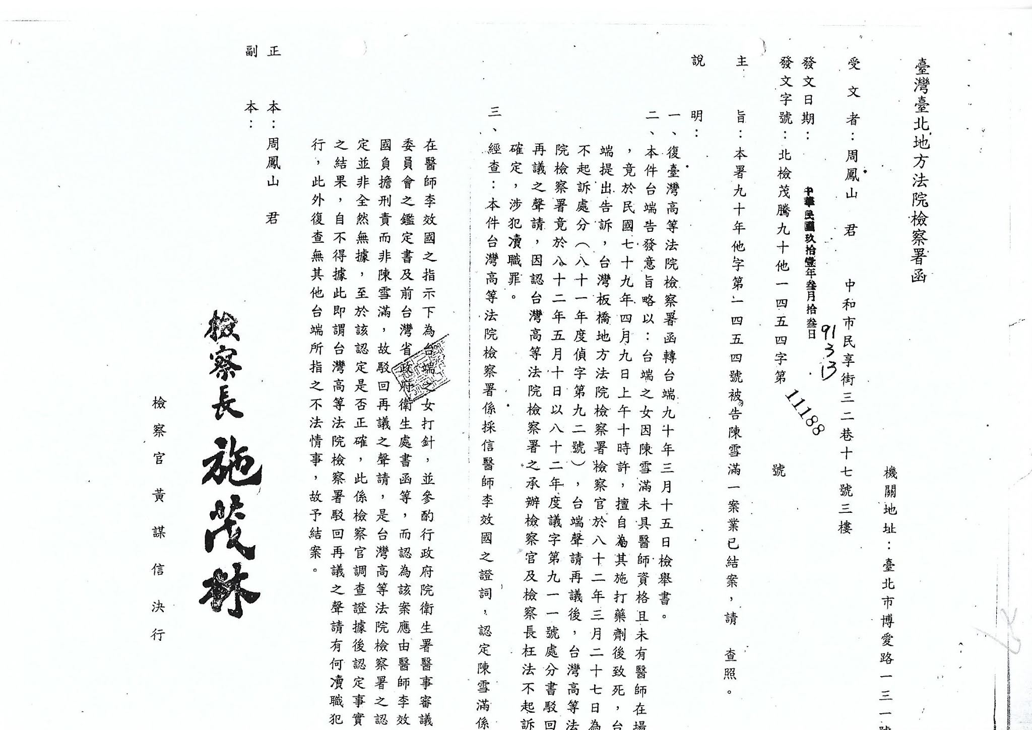 受文者:台北地方法院檢察署 檢察長