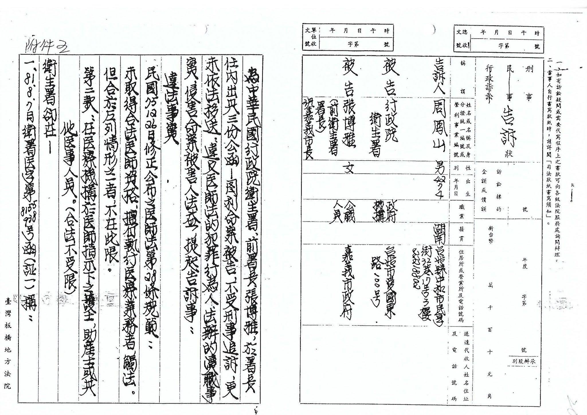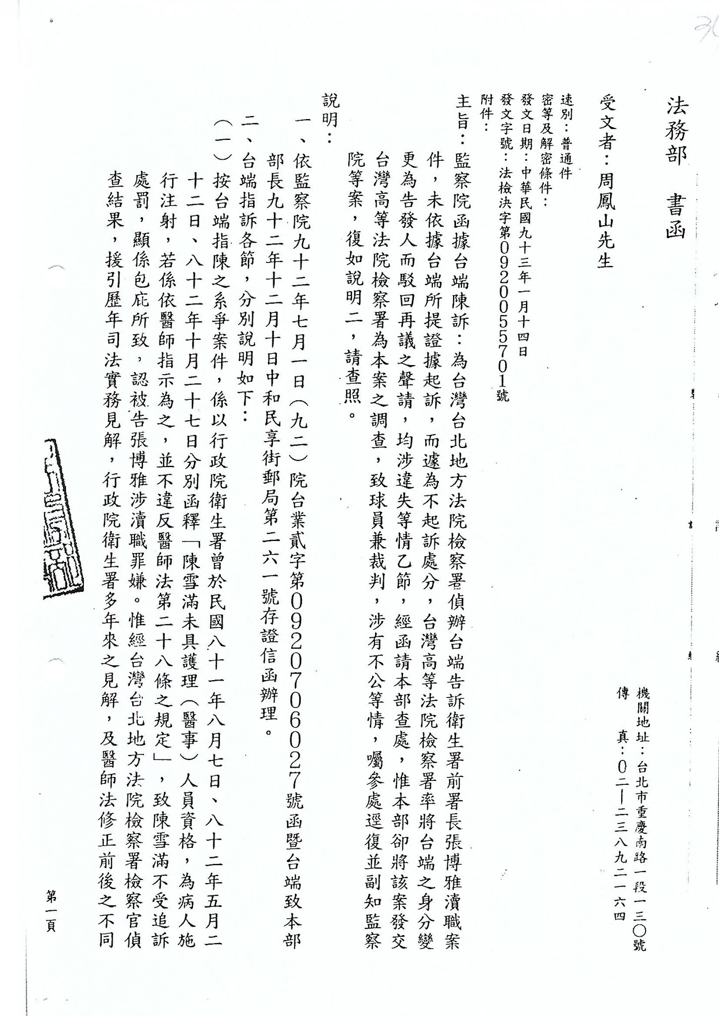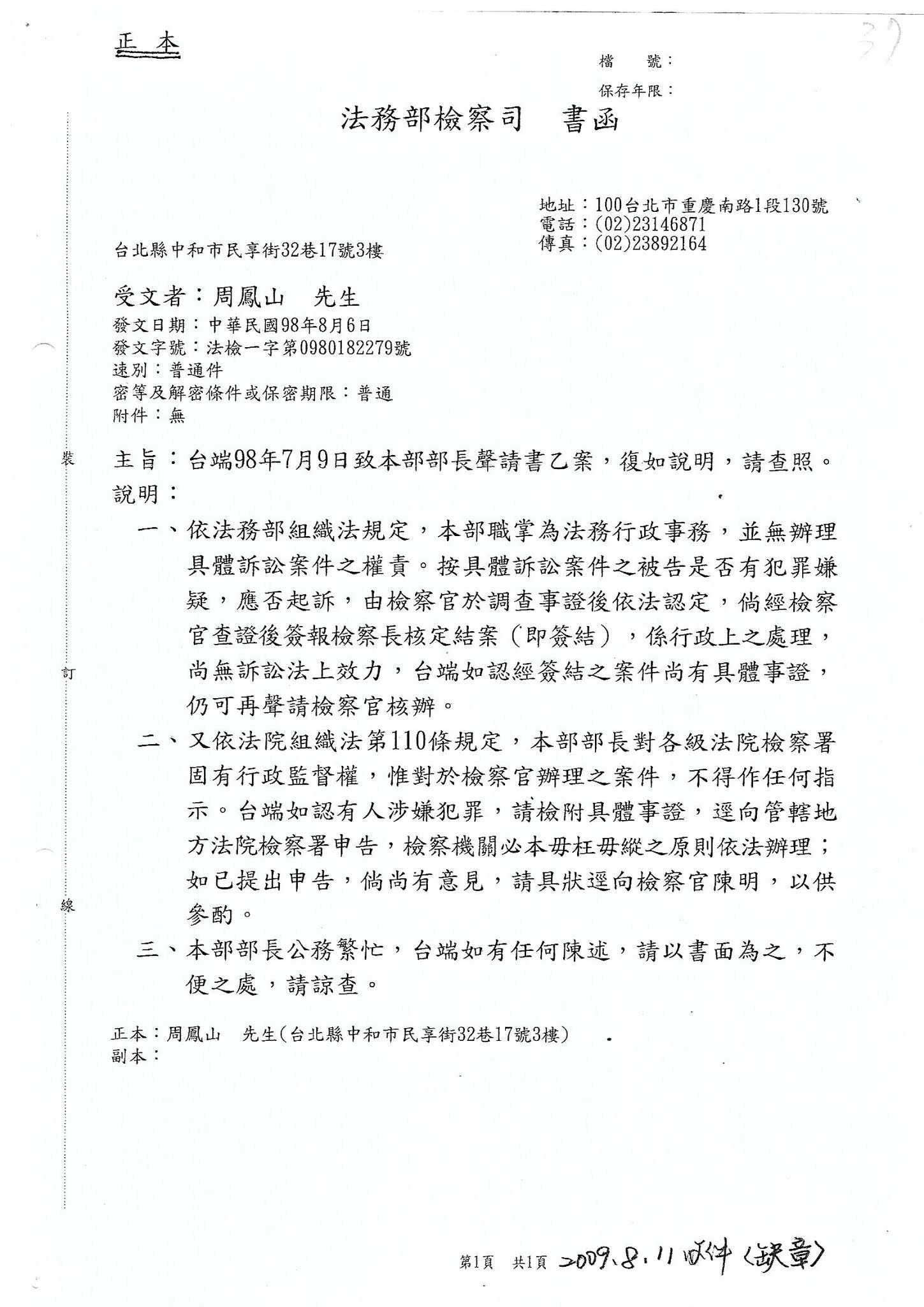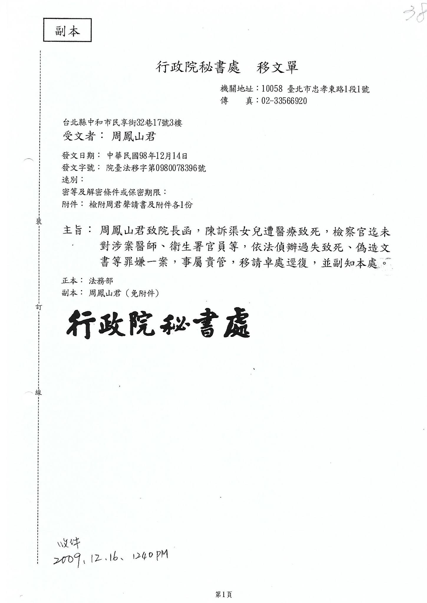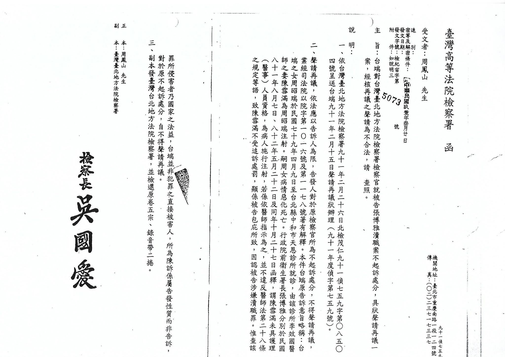 受文者:台北地方法院檢察署 檢察長