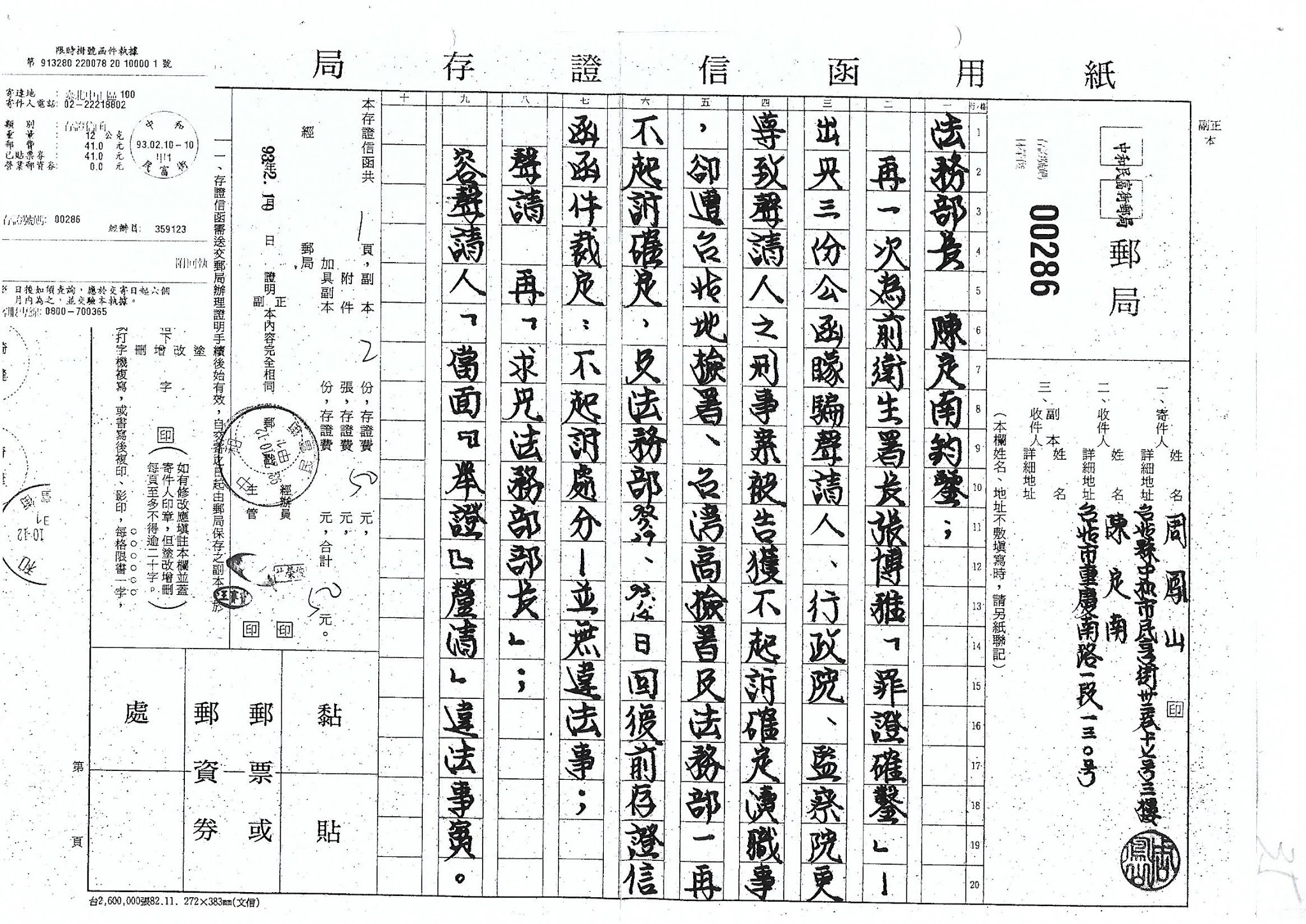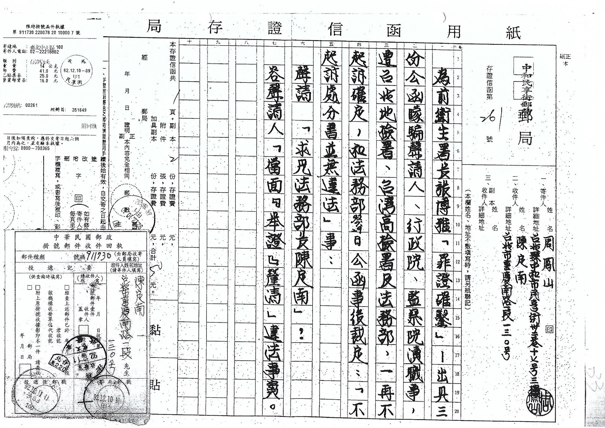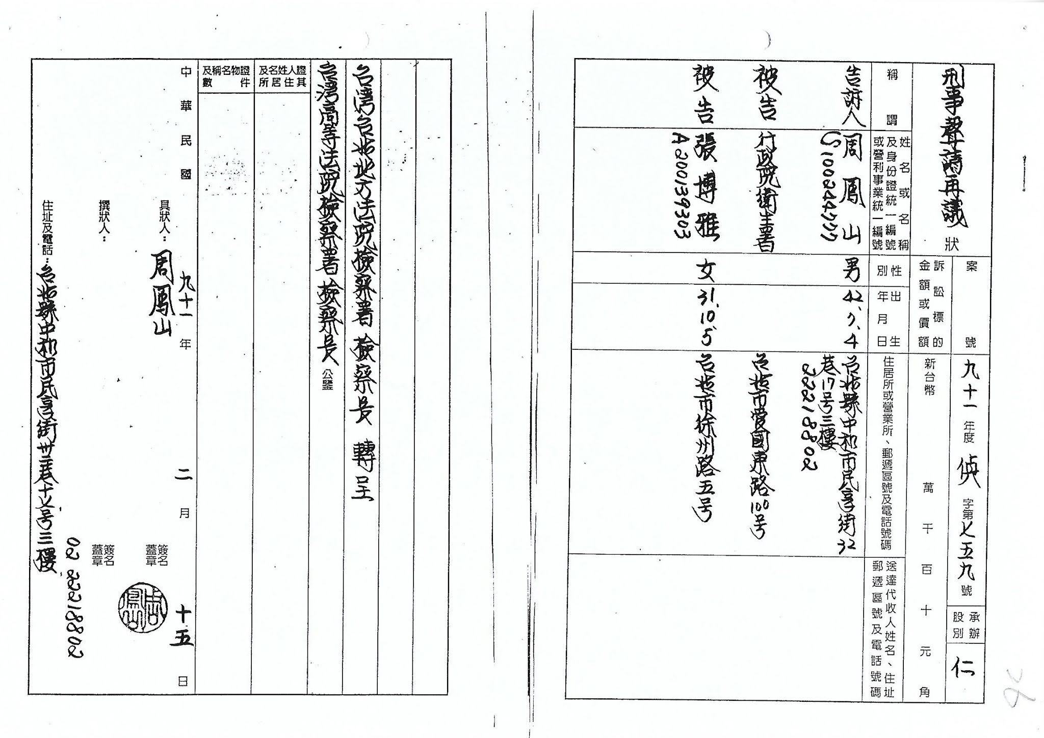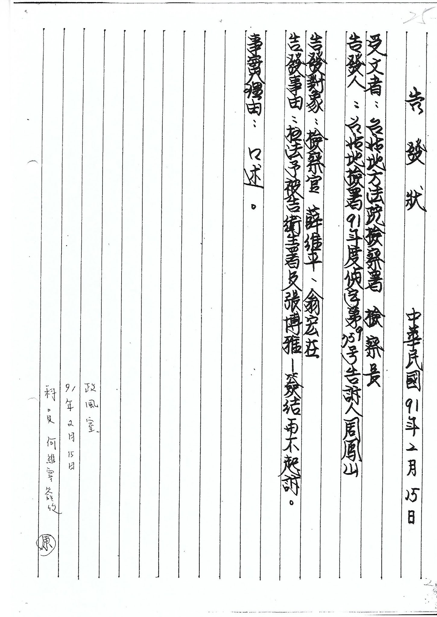 民國91年2月15日 具狀向台北地檢署檢察長檢舉兩位檢察官枉法吃案