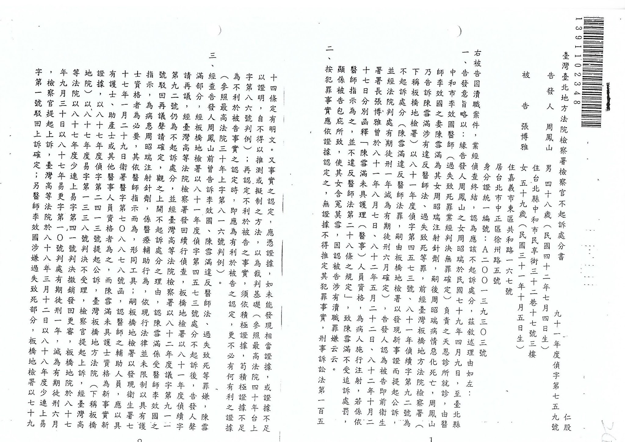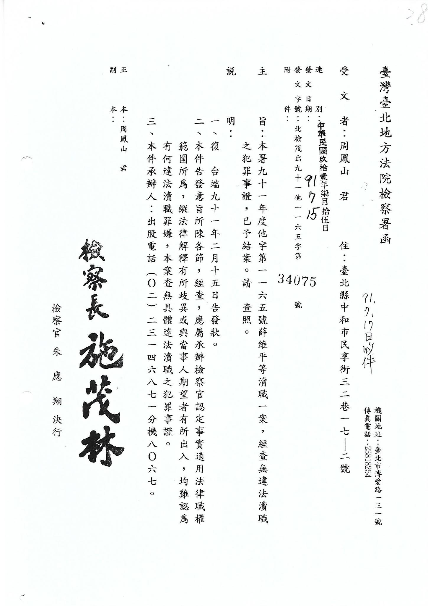 告發人:台北地檢署91年度偵字第759號 告訴人 周鳳山