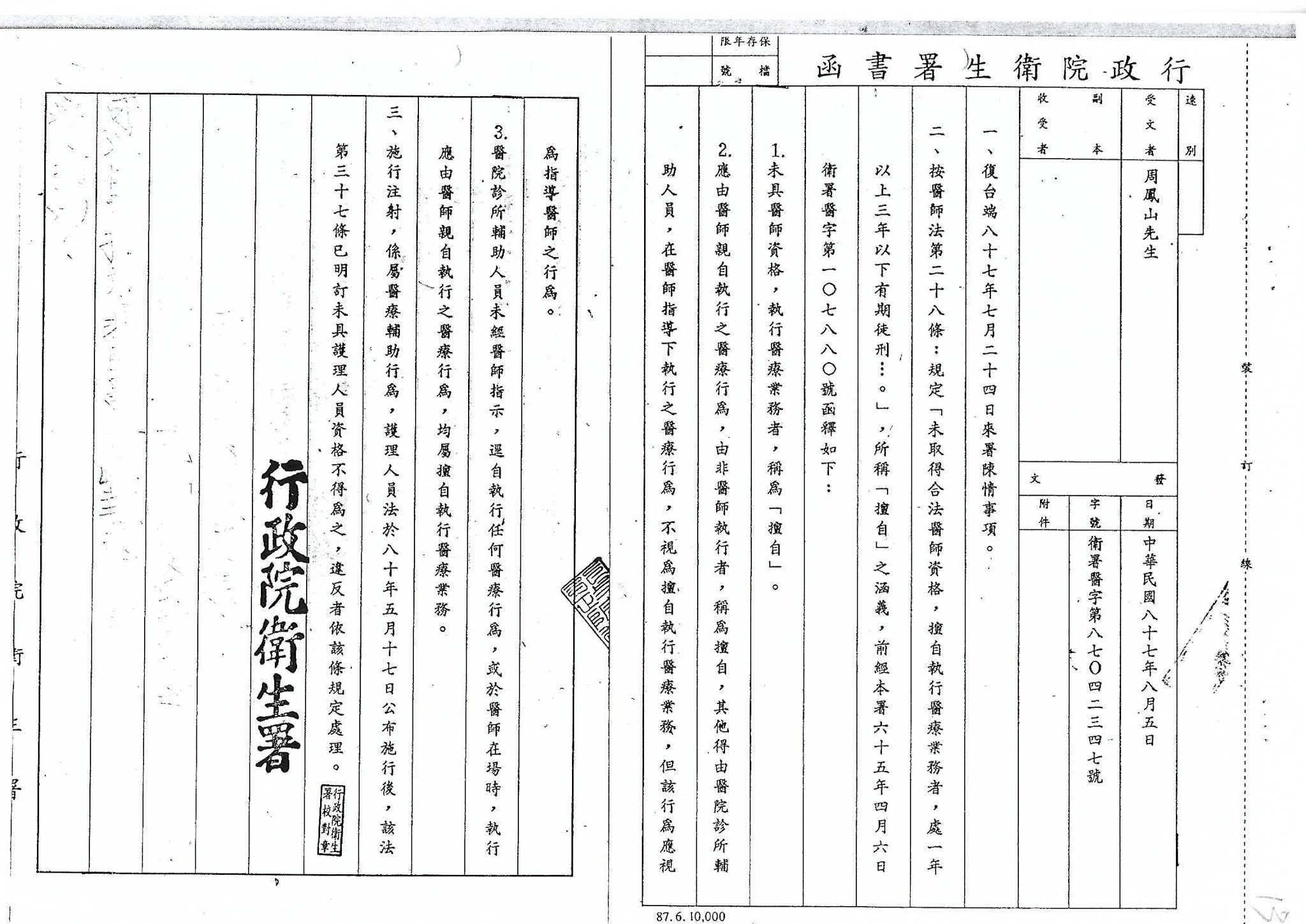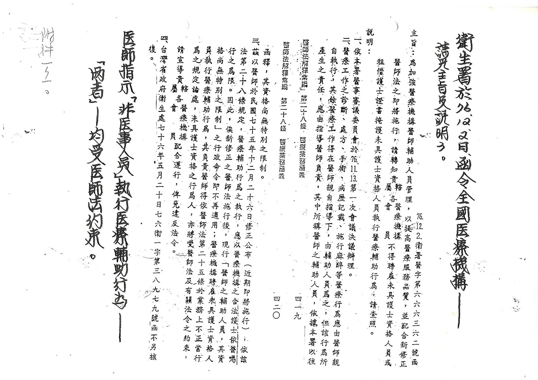 ▃民國76年12月2日 衛生署函令全國醫療機構