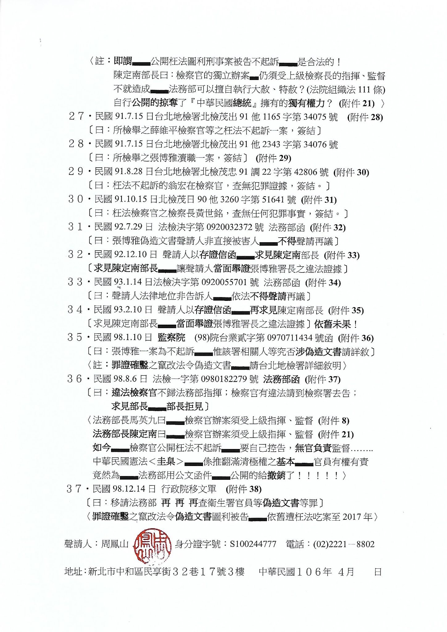 民國106年4月6日▃▃周鳳山的聲請書 請諸君看清楚▃是於民國109年8月13日收掛號