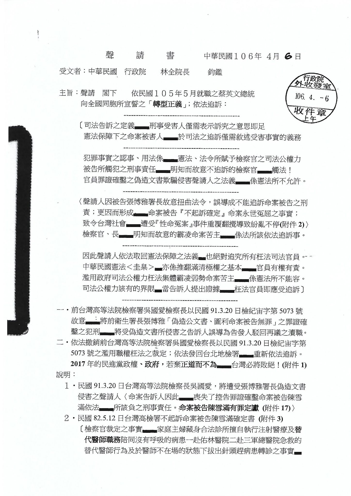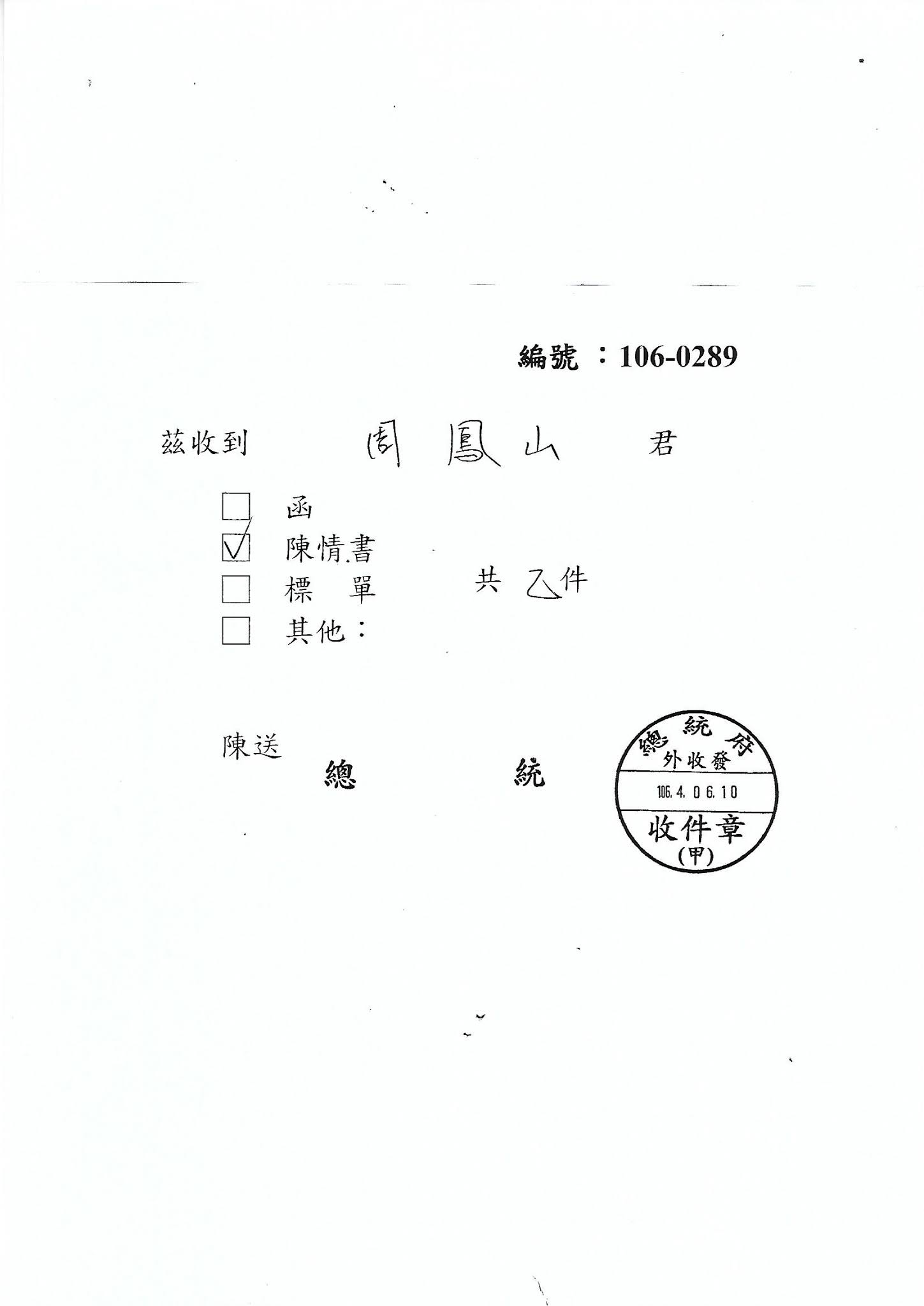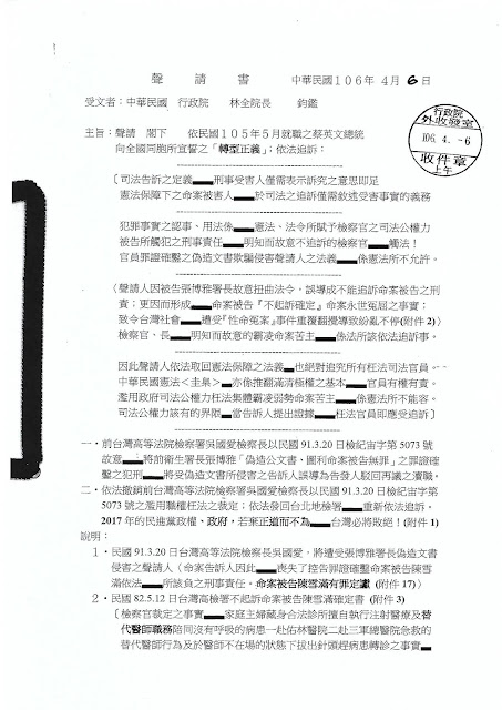 民國106.4.6日親送給蔡英文總統行政院長的聲請書