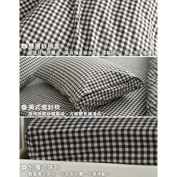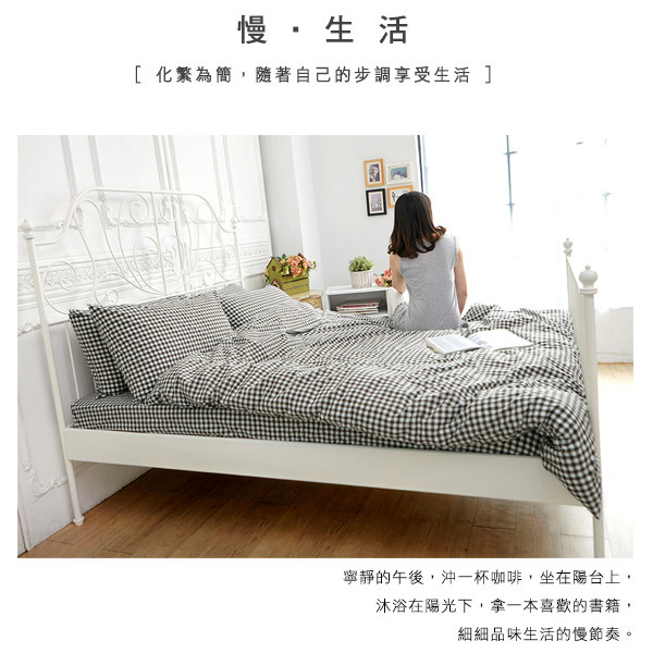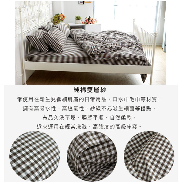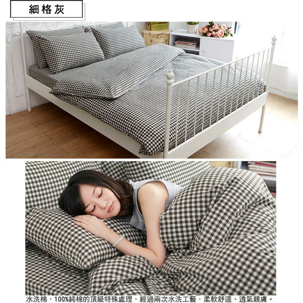 雙層紗水洗棉 無印簡約風 雙人床包被套四件組-格紋灰 台灣製造