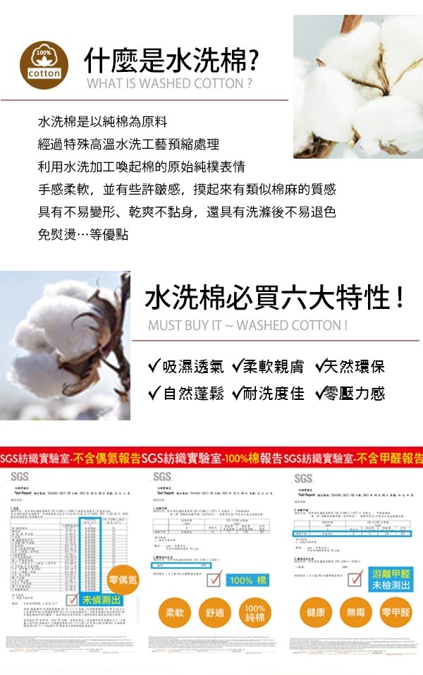採用長纖全棉為原料,棉纖維細長,經過兩次水洗工藝,手感柔軟,帶有些許皺感,摸起來有點類似棉麻的質感,具有不易變形,乾爽不黏身,且洗滌不易退色的優點!