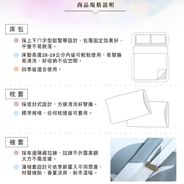 ●內容件數:床包X1+被套X1+枕套X2,共4件/組