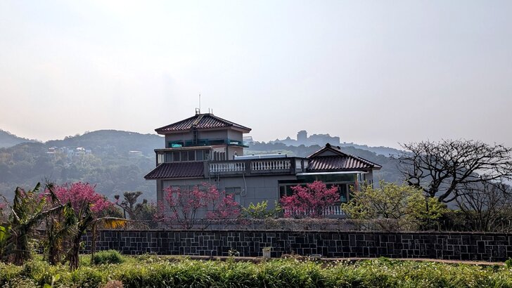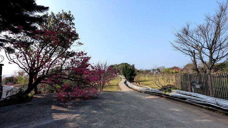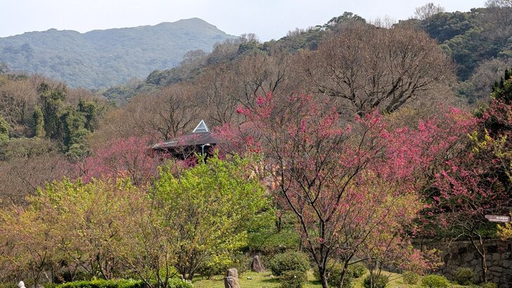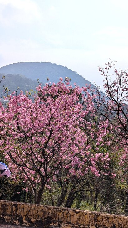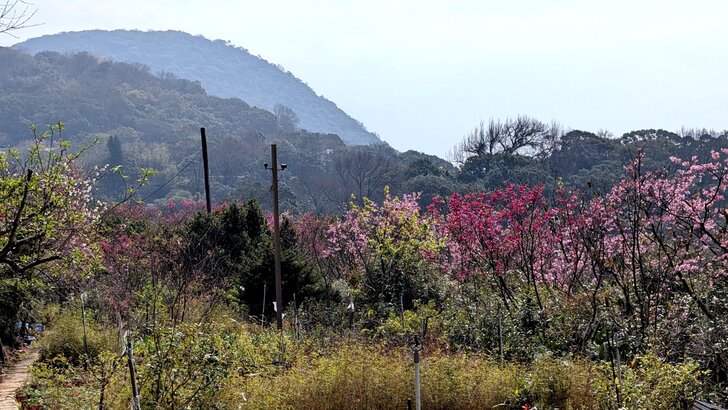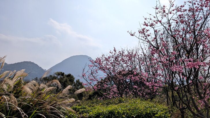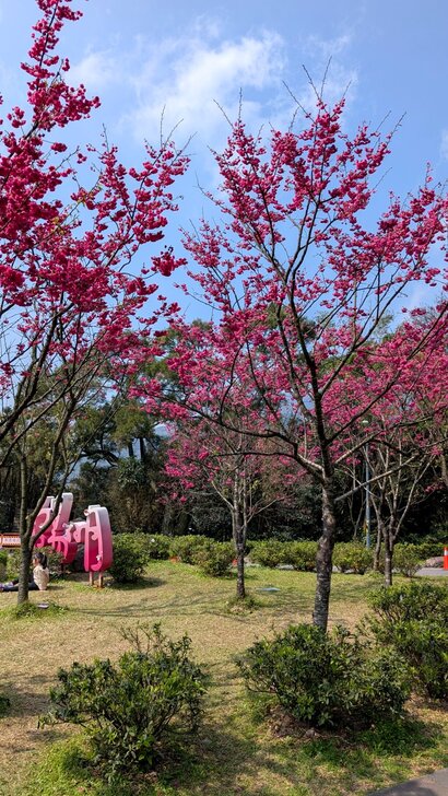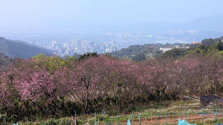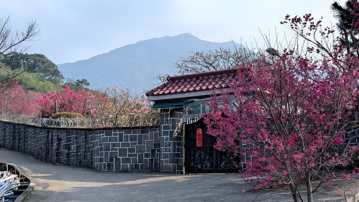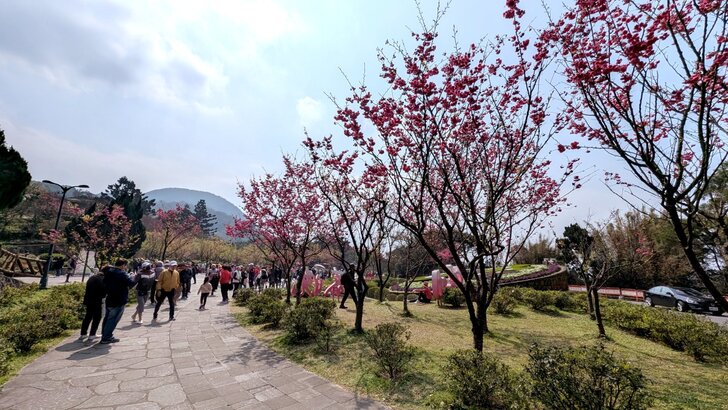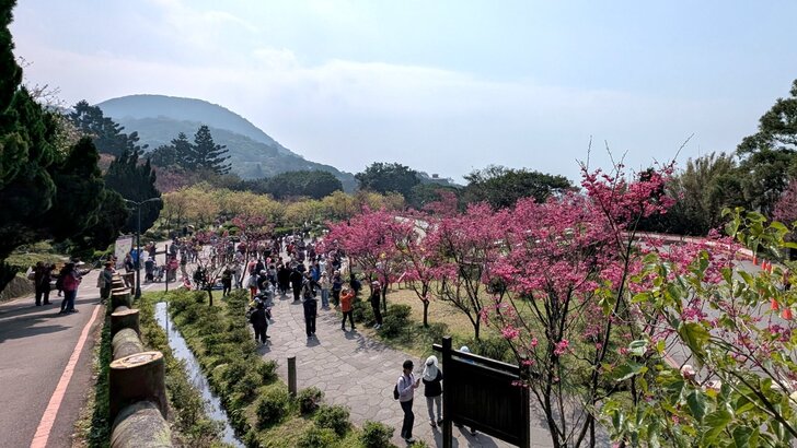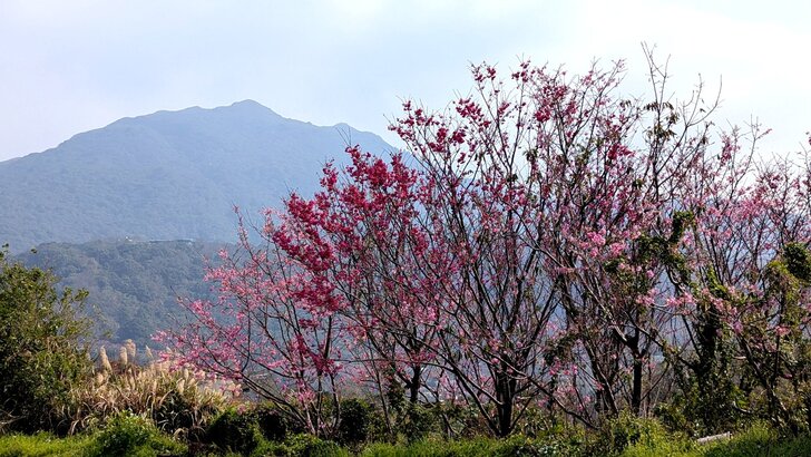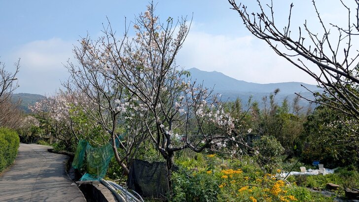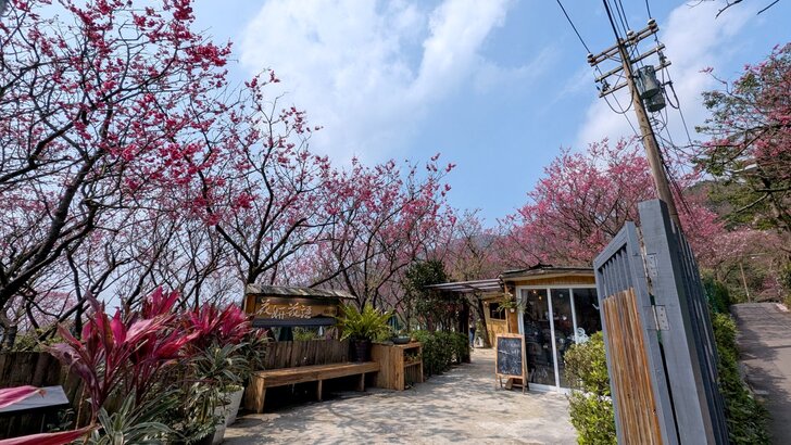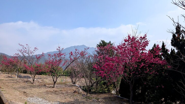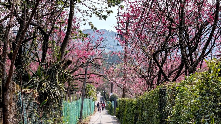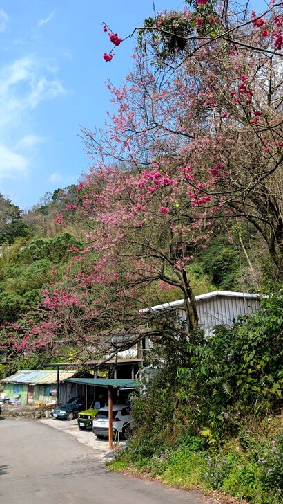 離開花鐘,由旁邊的小柏油路往大坑廟走去,大坑廟旁私人櫻花林正是最美的時候!↓