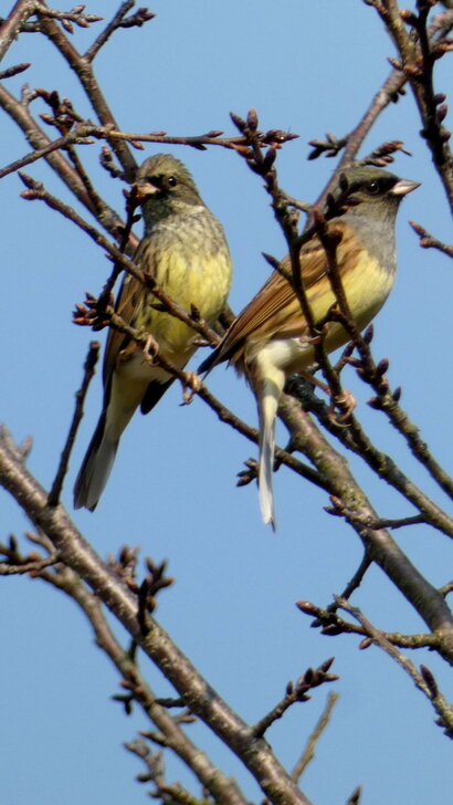 一對灰頭黑臉鵐飛上枝頭,也有飛到旁櫻花旁,可惜來不及照就飛走了!↑